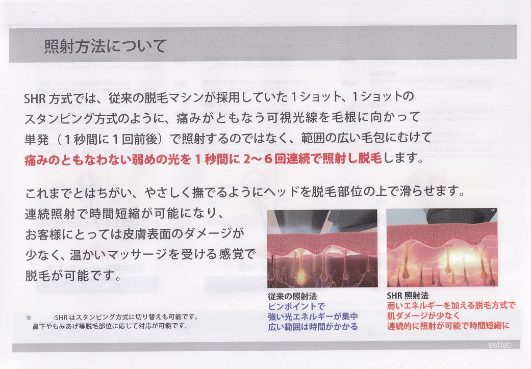 この機器は痛みや皮膚のダメージが少ないSHR方式を採用しております。光エネルギーで皮膚を照射し、真皮の温度を段々に増加します、周りの皮膚と組織を損害しない状況、有効的に毛包を破壊し、ヘアーの再生を防止します。徐々にリピートの短いパルスが真皮層に伝送していきます。